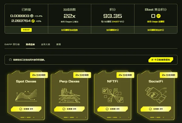 經過小編實測,就算是 Blast 生態新人,完成教學內全部交互內容後可以直接提升22倍積分乘數,相當於存入金額的22倍挖積分速度效率。