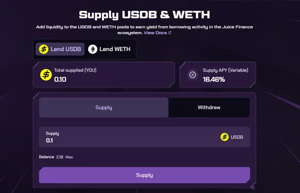 前往借貸應用 Juice,在借出頁面中選擇借出 vUSDB or $WETH,金額不限,一點點即可,借出後可以即刻取出。