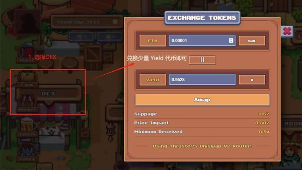- 進入遊戲市場中的 DEX,兌換一些遊戲代幣 $Yield