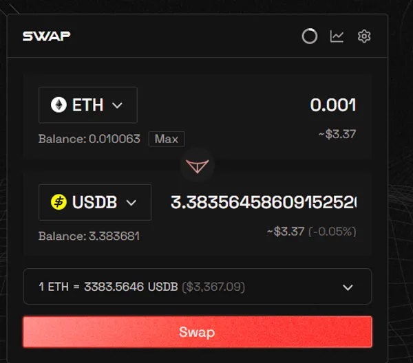 互動方式也很簡單,進入 Thruster 界面進行 Swap 互動即可。這裡推薦少量兌換 $USDB 和 其它任意幣種,之後互動其它板塊用得上。