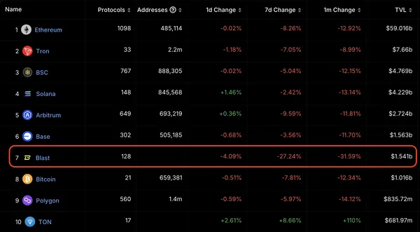 Blast 的這次空投不僅增加了其在市場上的知名度,還強化了其社群的黏性。根據 DefiLlama 的最新數據顯示,Blast 的總鎖倉量(TVL)達到 15.4 億美元,在所有區塊鏈中排名第七。