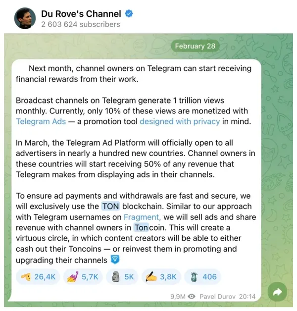 今年 2 月底,創始人杜洛夫在其 Telegram 頻道中表示,Telegram 廣告平台(月瀏覽量超過一萬億次)三月份將正式向近百個國家的所有廣告客戶開放,頻道所有者將獲得所有廣告收入的 50%,所有的廣告費用都以 TON 結算。
