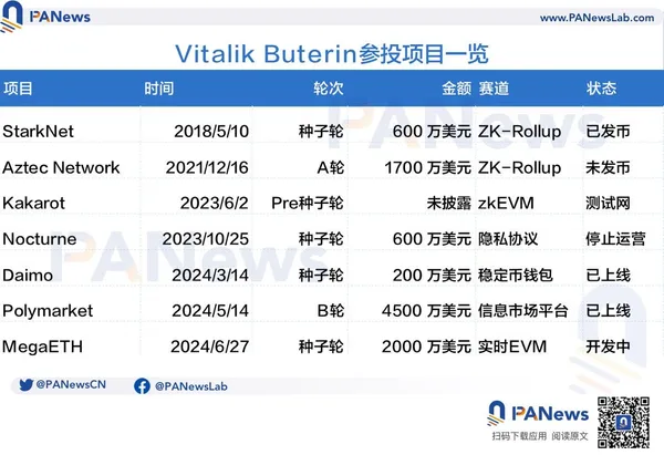 在Vitalik投資的7個項目中,基本都是圍繞隱私協議、EVM、Layer2、錢包等加密基建具有創新的項目。這些項目中,僅有StarkNet已經發幣,算是在財務上給Vitalik提供了回報。當中也有Nocturne這種曇花一現的,和Polymarket這種抓住風口的大熱項目,還有MegaETH這種潛在的未來新星。