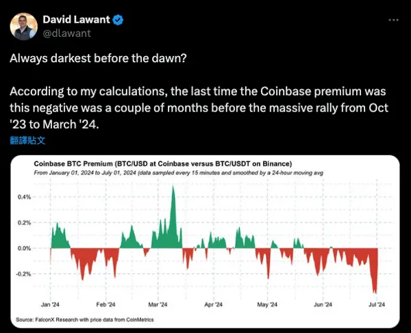 近期, FalconX 研究主管 David Lawant 指出,Coinbase 溢價指數呈現較大的負值,上次出現相同情況,正好是在去年 10 月至今年 3 月暴漲前的幾個月。