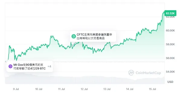 不過,川普在遭遇槍擊後,在5萬美元徘徊已久的比特幣,不僅持續上漲,甚至突破6萬美元大關,創下了一周以來的新高。
