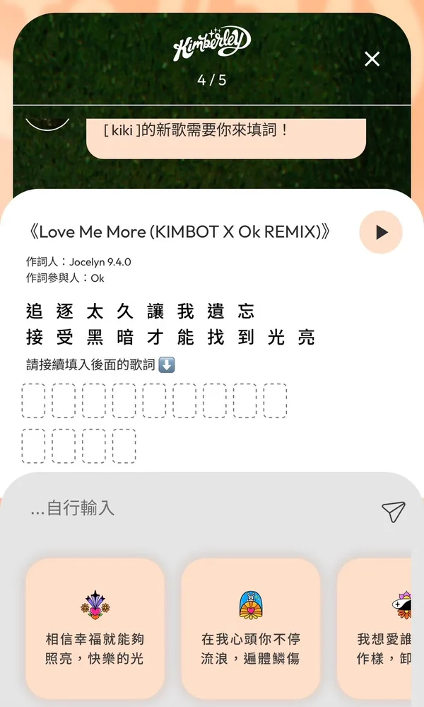 由新創AI音樂應用公司Acappella.ai打造的kimbot,能以陳芳語平時講話的口吻,與每一位粉絲進行對話式交流,讓粉絲們感受到與本人交流的親密感。 kimbot還具有一項特別的AI功能——「Lyrics Swap」,粉絲們可憑藉靈感填入一段歌詞,陳芳語就會立刻唱給你聽,生成一段專屬於你的音樂。