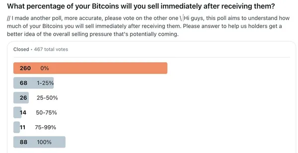 在某位用戶發起的「付款後你計劃出售多少比例的比特幣」投票中,有52.1%的參與者選擇出售0%-10%,10.8%選擇出售90%-100%,剩餘選擇則出售20%至90%。