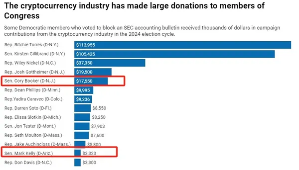 據Open Secrets報導,Booker在2024年從加密行業獲得了17,550美元的捐款。