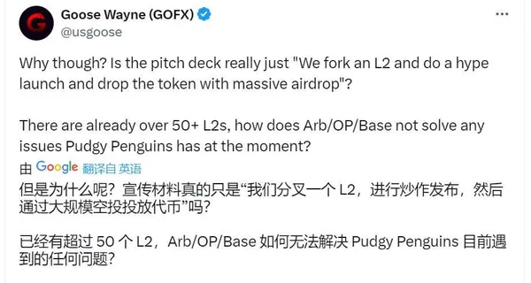 然而,在許多NFT項目市場表現低迷的背景之下,Pudgy Penguins的L2計劃卻引發社區調侃。Goose Wayne (GOFX) @usgoose評論說,「但是為什麼呢?宣傳材料真的只是『我們分叉一個L2,進行炒作發布,然後通過大規模空投投放代幣』嗎?已經有超過 50 個 L2,Arb/OP/Base 為何無法解決 Pudgy Penguins 目前遇到的任何問題?」