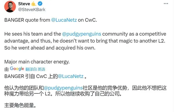 不過,也有用戶表示支持,比如Steve@SteveKBark表示,Luca Netz 展示出了「主要角色能量」,他認為他的團隊和Pudgy Penguins社區是他的競爭優勢,因此他不想把這種魔力帶給另一個 L2。所以他繼續收購了自己的公司。