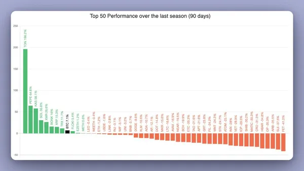 此外,從下圖可看出,在90天內,只有TON、SOL、Memes和BTC表現出顯著的增長。其他所有所謂的「高技術」山寨幣都紛紛下跌。