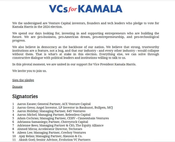 兩天前,超過200名風險投資家簽署信件,公開支持卡瑪拉.哈里斯入主白宮,稱如果沒有「強大、值得信賴的機構」,矽谷和其他行業將會崩潰。
