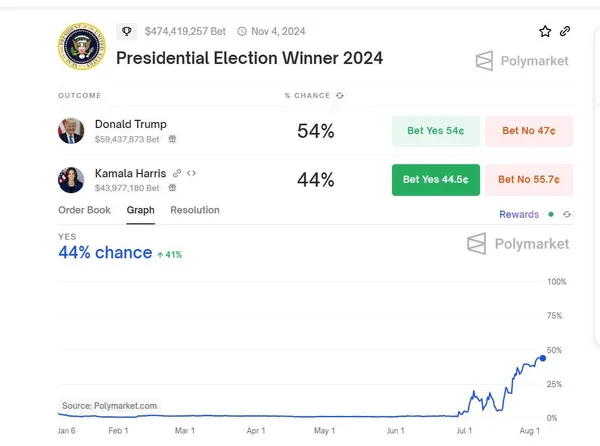 今日(8月2日),預計成為美國民主黨總統候選人的卡瑪拉.哈里斯(賀錦麗)在預測市場Polymarket上的獲勝機率升至歷史新高45%,隨後回落至44%。川普獲勝機率降至54%,而7月16日拜登退選前幾日,川普獲勝機率為71%。