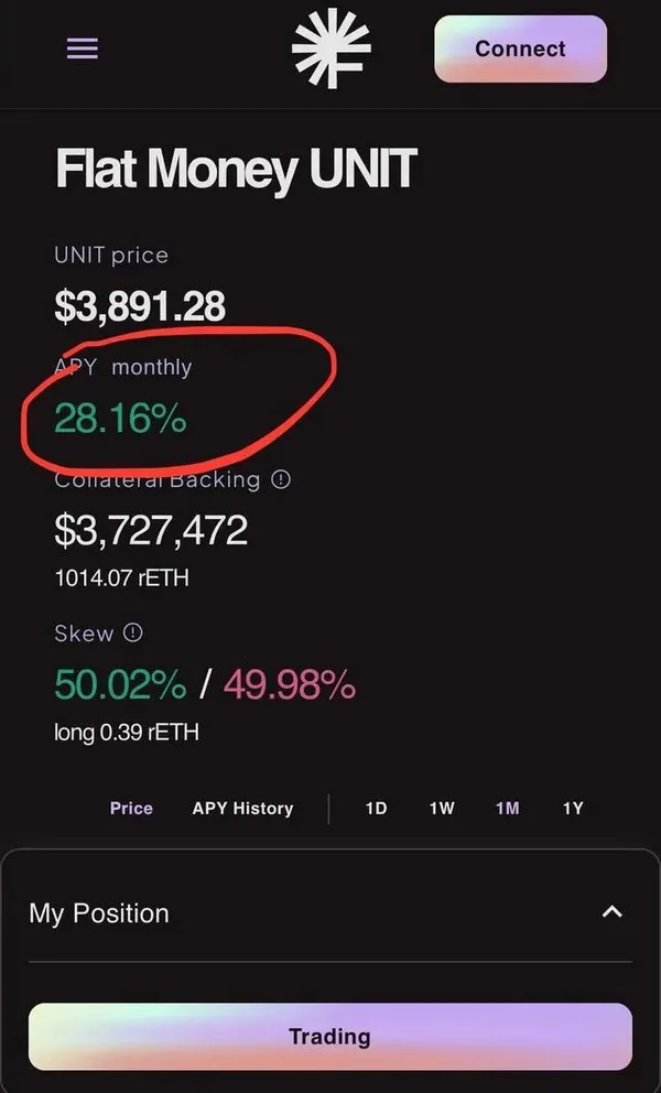 通過鑄造 UNIT,你可以獲得來自 Flat Money 交易所上 rETH 槓桿交易者支付的費用,收益通常在 20-30% APY 之間。