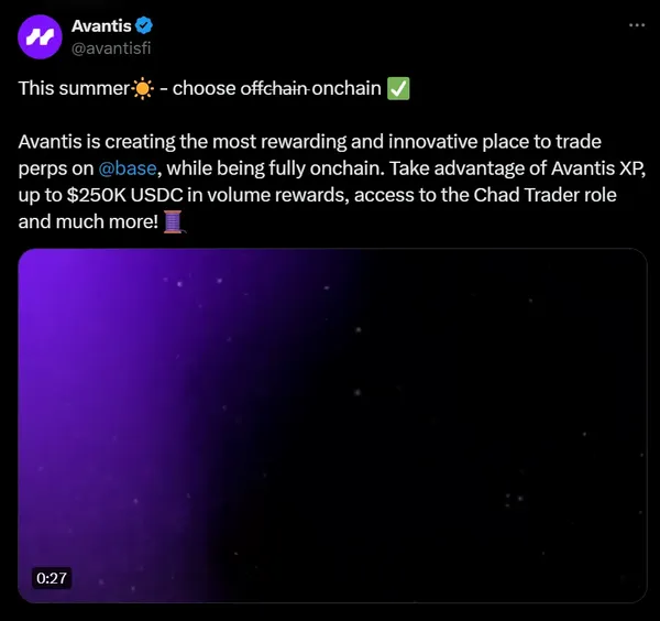 本周的下一個農場是 Avantis,一個支持 RWAs 以及各種代幣的 Base 上的永續交易所。
