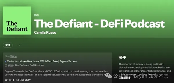 The Defiant - DeFi Podcast是一個專注於 DeFi 的播客,由著名的金融記者和作家Camila Russo(CamiRusso)主持。她在節目中與DeFi領域的創新者和實踐者進行深入對話,涵蓋從DeFi協議、NFT到Web3和加密貨幣的最新發展,探討區塊鏈技術如何改變金融世界。