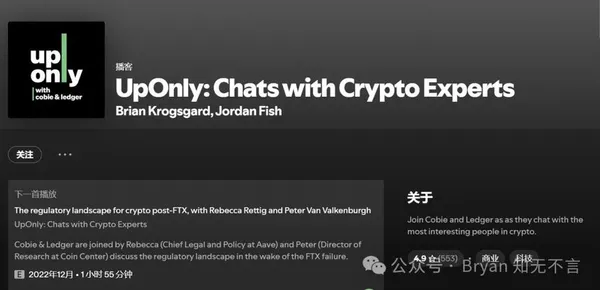 UpOnly: Chats with Crypto Experts 是一個備受歡迎的播客節目,由加密貨幣分析師Cobie(Jordan Fish)(cobie)和加密貨幣評論員Ledger(Brian Krogsgard)(Krogsgard)共同主持。他們邀請加密貨幣領域的頂尖專家、交易員和從業者參與節目,分享他們的經驗和見解。Cobie和Ledger透過輕鬆有趣的對話方式,深入探討了區塊鏈技術、市場動態和未來趨勢,吸引了大量聽眾。