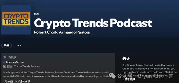 Crypto Trends Podcast 是一檔由成功企業家Robert Croak(robert_croak)和資深金融技術專家Armando Pantoja(_TallGuyTycoon)共同主持的播客節目,旨在為聽眾提供關於加密貨幣市場的最新見解和趨勢分析。