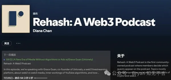 Rehash: A Web3 Podcast(rehashweb3)是一檔由Diana Chen主持的社區所有播客,專注於Web3、DAO和區塊鏈技術等話題。這個播客的獨特之處在於其社區治理模式,聽眾可以透過持有播客的NFT來提名和投票決定每一季的嘉賓,從而深度參與節目的製作過程。