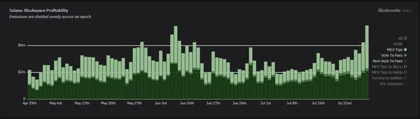 而與此同時,Solana驗證者們正因為機器人交易賺的盆滿缽滿,Dan Smith透露,7月29日,產生的費用總額為 550 萬美元,是過去三個月中的最高數額。58% 的價值來自 MEV 小費,37% 來自優先交易費。