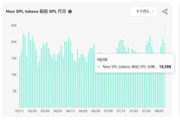另一個數據也側面說明了Solana上的表面繁榮,從每日發行的代幣數量來看,Solana的新SPL代幣發行數量並未迎來大幅下滑,仍維持在每日2萬個代幣發行左右。