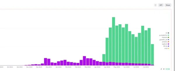 這一數據說明,Pump.fun上發行代幣的數量並未下滑太多,但能夠成功上線Raydium的比例越來越低,目前已最高不超過3%,而在7月初這個數據約為7.3%。8 月 12 日,據 Dune 面板數據,Pump.fun 過去 24 小時發行 11796 種 Meme 代幣,僅僅 157 種最終上線 Raydium,僅占 1.33%。