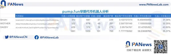 PANews隨後將Pump.fun上市值前三的代幣在最初創建時的交易數據進行分析發現,2個月以前,Pump.fun的機器人比例僅為35%左右,並且真實的用戶交易數量和交易筆數都遠高於現階段。