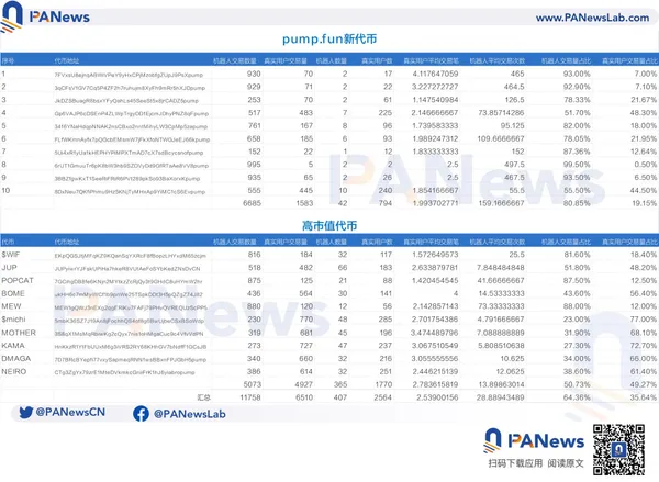 但這一數據可能未必正確,PANews隨機從Pump.fun上尋找了10個相對活躍的代幣,並對這些代幣最近1000筆的交易情況進行了分析。設置的算法以兩個方面進行機器判定,短時間內(小於10秒)進行買賣或者在交易當中出現的相同地址相同金額的重複交易。在分析後的結果發現,在這10個代幣的共計8268筆交易當中,有80.85%的交易來自機器人交易,真實用戶的交易量不足兩成。機器人占比最高的代幣占比達到99.5%,平均每個機器人這個區間內交易了159次,而真實用戶的平均值為1.99。
