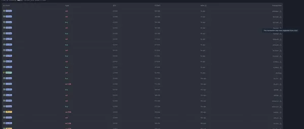 如果經常交易MEME幣則會發現這種情況在pump.fun上非常嚴重。隨機打開pump.fun的一個代幣交易頁面,會發現如下圖所示(列表最後有嘆號的為機器人交易),機器人的交易已經占據了大多數交易。
