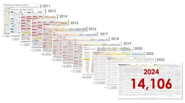在許多方面,Web3 增長行業與 2010 年代數位行銷的興起和衰落平行。MarTech 領域急劇擴展,從 2011 年的 150 家公司到 2024 年的 14000 多家。