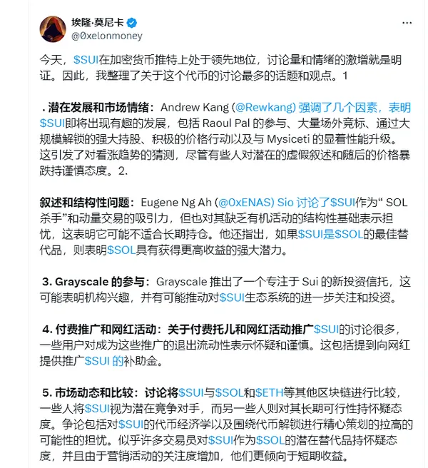 Raoul Pal在推特上表示,「我在尋找下一個 SOL 類型機會的主要代幣,而SUI就是其中之一。」不過,Raoul Pal的喊單也引發了一些質疑,他本人也說明,他是Sui基金會的董事,與Sui生態存在利益關係。