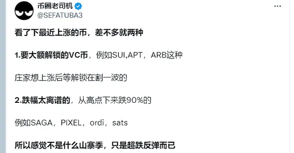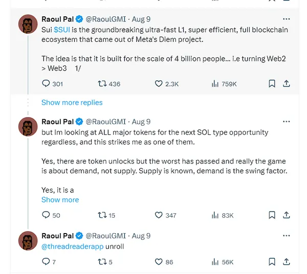 對於唱多SUI的言論最早來自在推特上具有百萬粉絲的Real Vision創始人兼執行長Raoul Pal,8月9日,他在推特上連發多條推文,通過對比SUI代幣與其他多個主流公鏈的治理代幣的走勢圖後,他得出的結論是:「$SUI 從價格的角度來看,它開始變得非常有趣,儘管還為時尚早,尚未得到證實,但它已經顯示出與大多數代幣相比的突破跡象。」