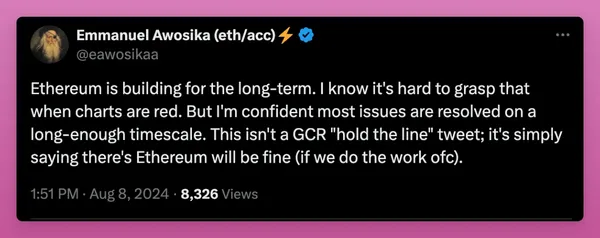 如果你需要更多樂觀的看法,可以查看Emmanuel的文章。他對以太坊的強大社區、持續創新和長期適應能力感到樂觀。
