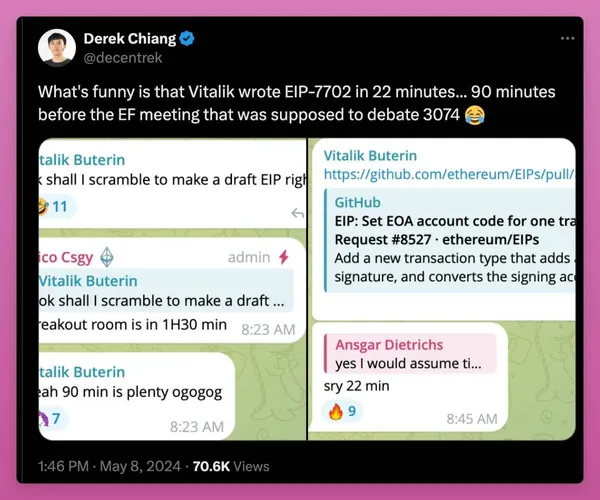 值得注意的是,EIP-3074 似乎被優先處理,而 Vitalik 在22分鐘內就完成了 EIP-7702 的撰寫!EIP-7702 也與未來的帳戶抽象實現相容。