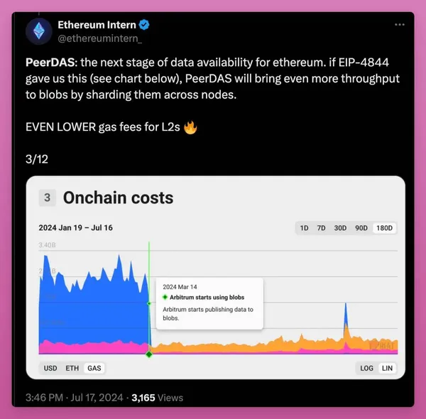 與之前的 Dencun 升級中的 Proto-Danksharding 類似,PeerDAS 將使 L2 上的交易成本更加便宜。不過,我沒有找到具體的數字來說明它能便宜到什麼程度(我認為在高使用時段,PeerDAS 會特別有用)。0xBreadguy 提到 Pectra 將把 blob 容量擴大 2x-3x。