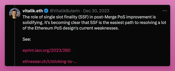 Vitalik 在2023年12月分享說,SSF 是解決以太坊 PoS 設計中大多數缺陷的最簡單方法。