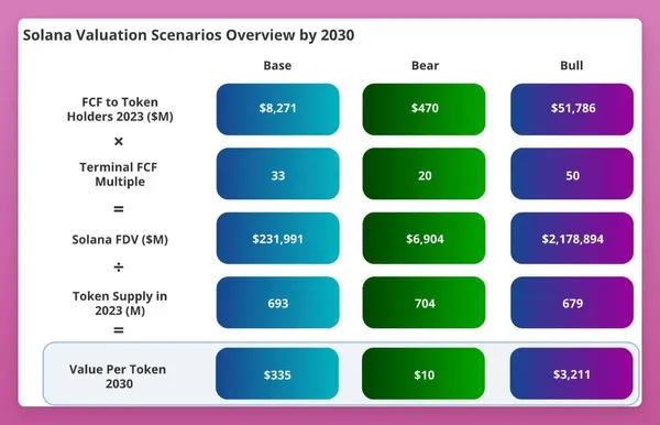 老實說,11,800美元的預測看起來相對悲觀(我希望五年後 ETH 的價格能更高),但請注意,VanEck 對 Solana 到2030年的基本預測僅為335美元。