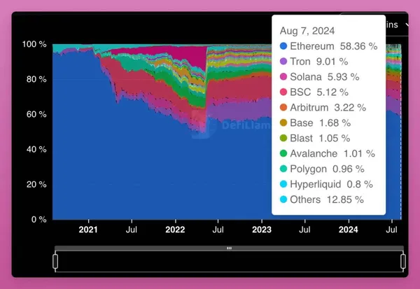 70%智慧合約市場主導地位的基本情景對我來說似乎相當合理,儘管目前以太坊的主導地位僅為58%(但如果計算所有L2,約為65%)。儘管 SOL 經歷了瘋狂的上漲,主導地位自2022年初以來保持不變。