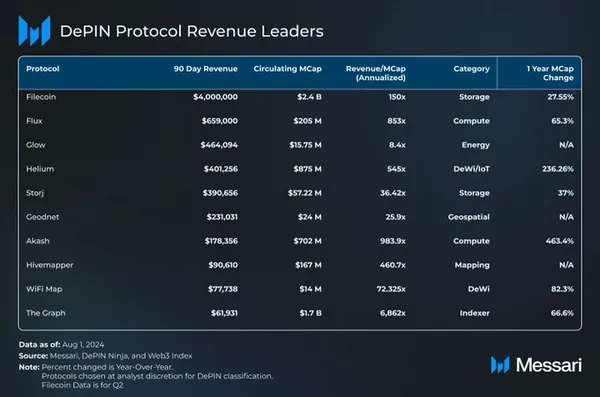 儘管 DePIN 項目的市值不斷攀升,但其收入增長卻未能同步跟進。目前,只有四個最大的 DePIN 協議在按收入排名的前八名中佔有一席之地。