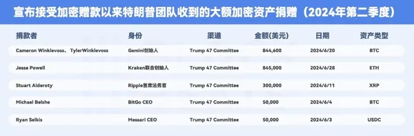 在川普競選團隊提交的第二季度 FEC 披露文件中,通過加密貨幣向川普競選團隊捐贈的個人包括 Gemini 兄弟、Kraken 聯合創始人 Jesse Powell、Ripple 首席法務官 Stuart Alderoty、BitGo CEO Michael Belshe、Messari CEO Ryan Selkis,捐款加密資產總額近 290 萬美元。另據 breadcrumbs 數據,自 2024 年 5 月接受 BTC 捐贈以來,至少價值 180 萬美元的 BTC 已捐贈給川普競選團隊。
