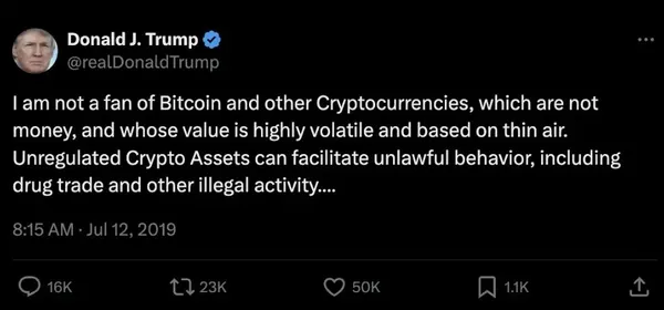 如果說 2024 年加密貨幣領域最受關注的議題,貫穿到底的是美國大選這一議題,相關 meme 幣橫飛、不落下政治大人物的每一場會議,一己之力再次帶火預測市場。處於這場漩渦中心的是美國前總統川普,其從加密冷感政客成為了如今振臂一呼支持比特幣的新一屆總統候選人。加密,成為今年川普競選的一個新突破點。