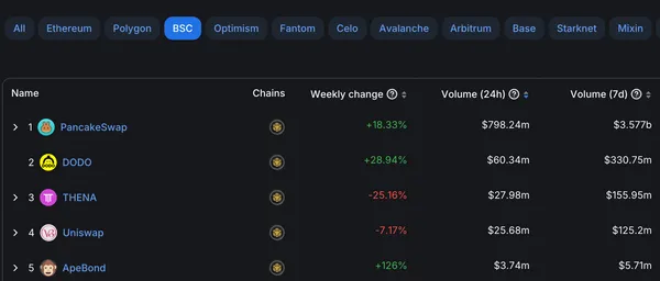 作為BNB Chain上交易量斷層式領先的龍頭,Pancake 的地位自然不必多言。雖然 Pancake 之後也拓展到了很多新的鏈比如 Aptos, Arbitrum 等,但其在 BNB Chain 的地位仍然無人撼動。