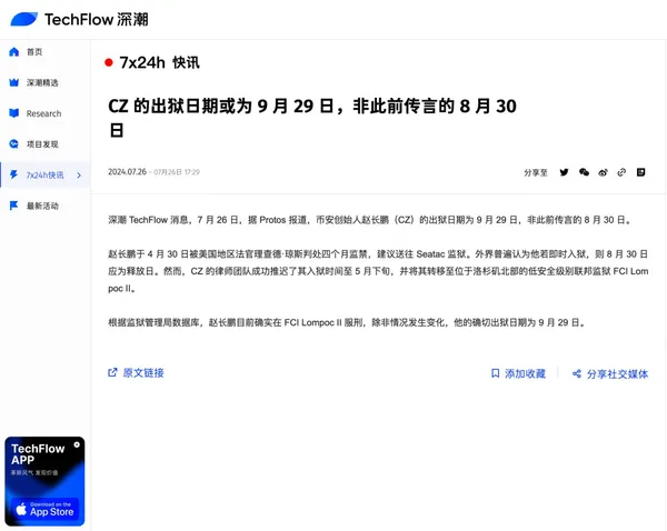 據目前的市場消息,CZ 最快可能於 9 月 29日 出獄,「CZ 出獄概念」板塊也逐漸被市場所討論。