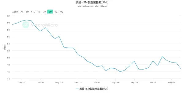 而製造業就業的疲軟可能展現出一定的導火線風險。除此之外,我們來看一下美國ISM製造業指數(PMI),可以看到PMI正處於快速下降的趨勢,這也進一步佐證了美國製造業疲軟的局面。