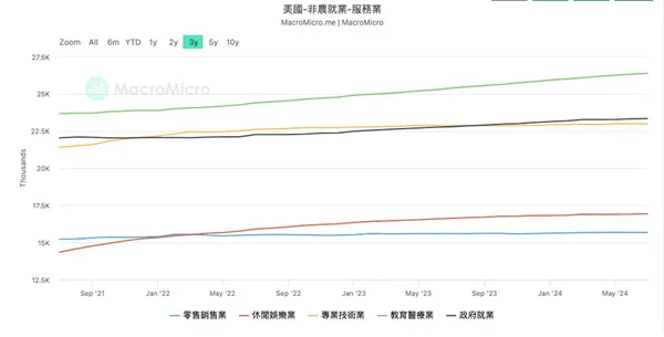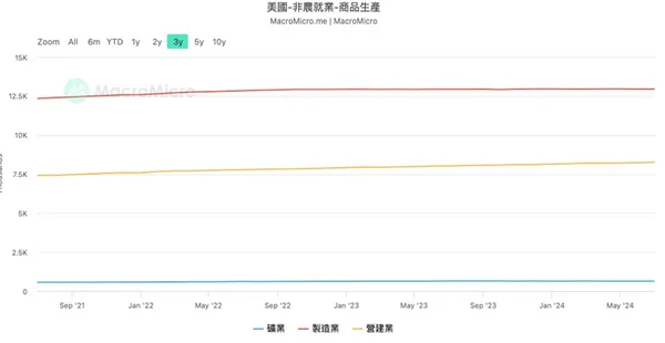 讓我們從非農就業數據的細項上來觀察一下具體發生了什麼事,可以看到在商品生產門類,製造業就業人數出現了較長時間的低波動震盪,對數據貢獻更多的是營建業。