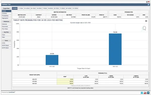 當前市場對9月利率決策的預估是將近75%的概率降25~50BP,25%的概率降50~75個BP,那麽密切關注市場的判斷,也可以較爲明顯的判斷市場情緒。