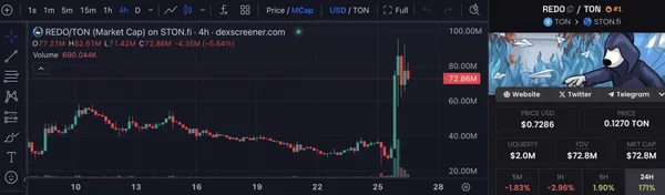 MEME 幣 REDO 則誕生於今年 1 月,因此次 Durov 被捕熱度再度飆升。Dex Screener 數據顯示,REDO 市值一度突破 9570 萬美元,過去 24 小時交易額達到 1700 萬美元。
