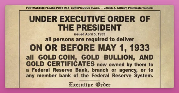 美國1933年禁止私人持有黃金。但研究表明,私人持有的黃金中只有20%至25%真正上繳到了當局。
