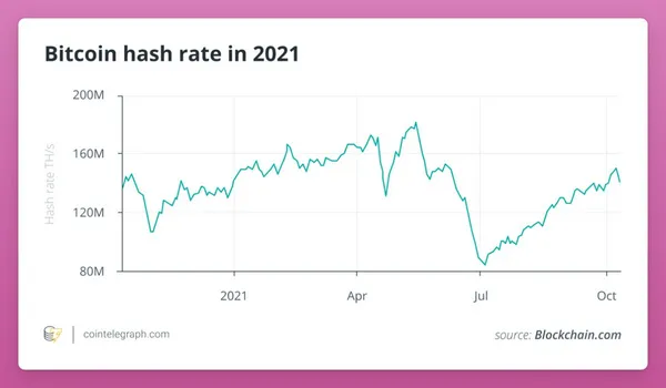 2019年巔峰時期,中國占全球比特幣挖礦業務的75%。此次打擊行動導致保護比特幣網路的計算能力(即哈希率)下降近50%。然而,隨著礦業轉移到其他國家,算力很快便恢復。