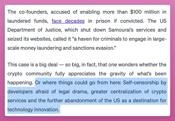 更現實的情況是監管部門的打擊。加密貨幣的隱私已經受到了攻擊。例如,Tornado Cash創始人、Samourai Wallet CEO兼CTO最近被逮捕,並被指控通過提供「混合」服務洗錢。